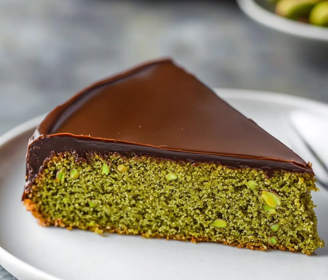 A flavorful gluten-free cake made with almond-pistachio flours and topped with creamy chocolate ganache.